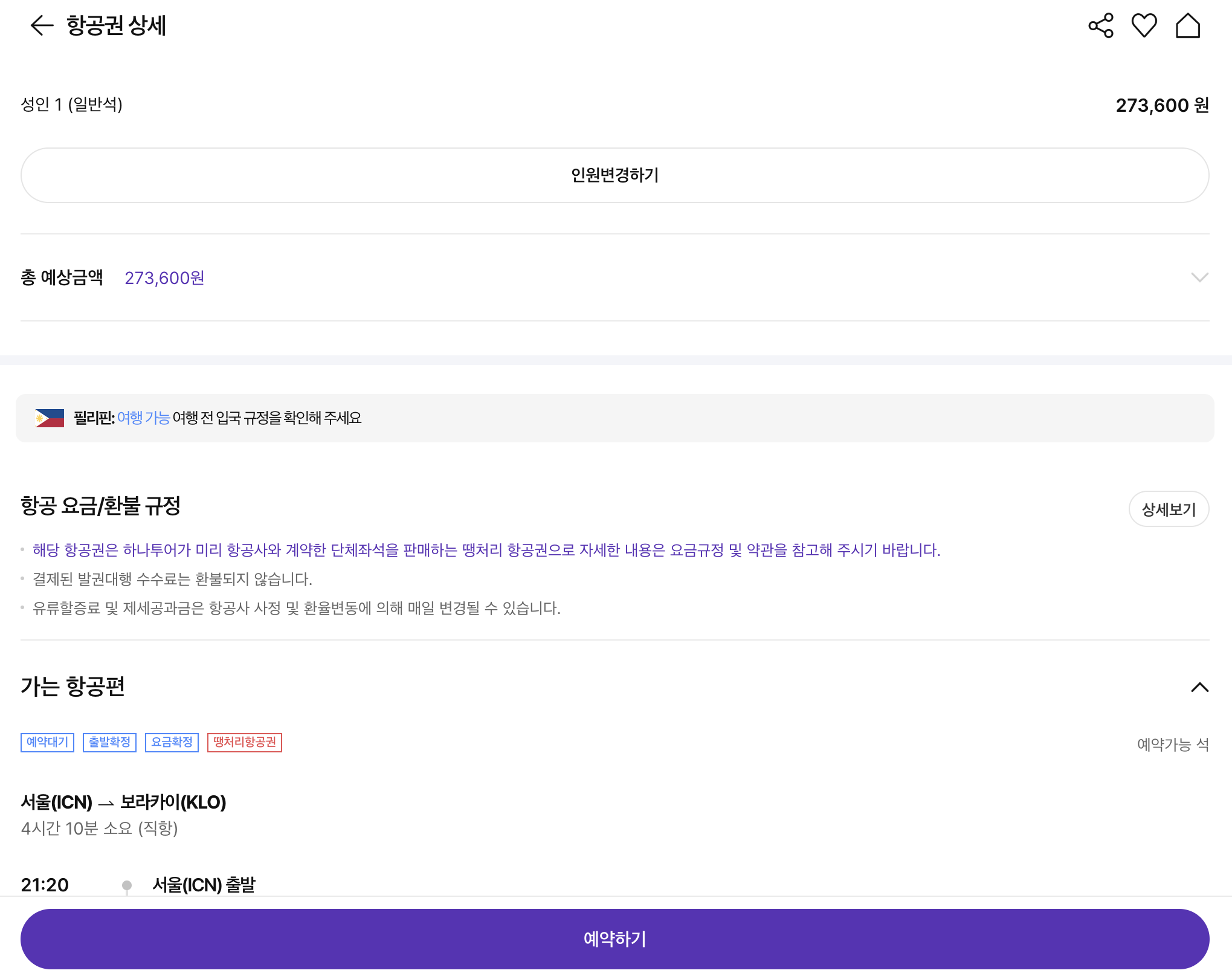 4. 마지막으로 인원변경을 하거나 바로 예약하기 눌러 탑승객정보입력 및 결제 완료후 예약을 완료합니다.